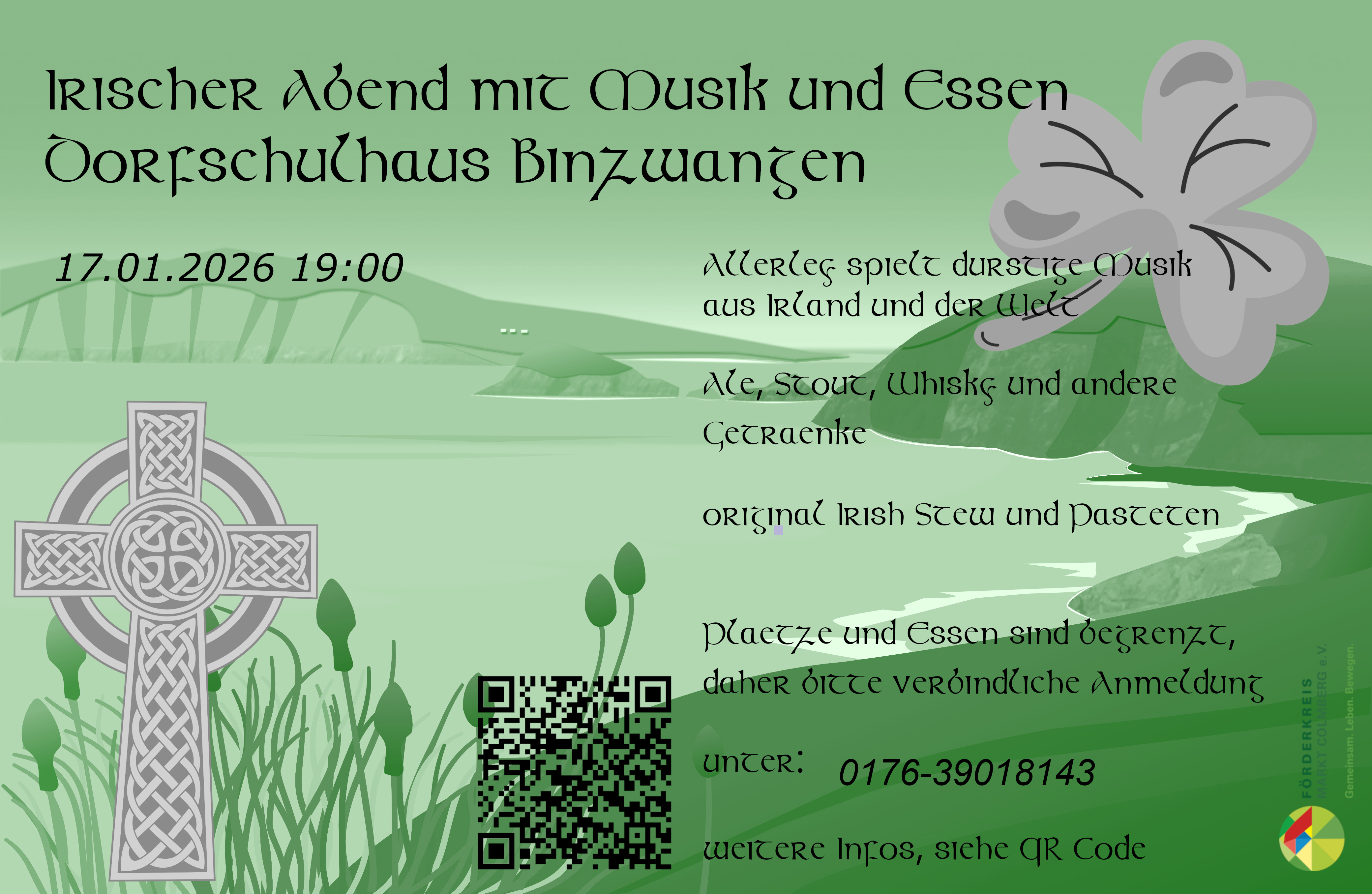 Die Dorfwerkstatt lädt herzlich ein zu einem stimmungsvollen irisch-internationalen Abend voller Musik, Genuss und guter Gesellschaft.